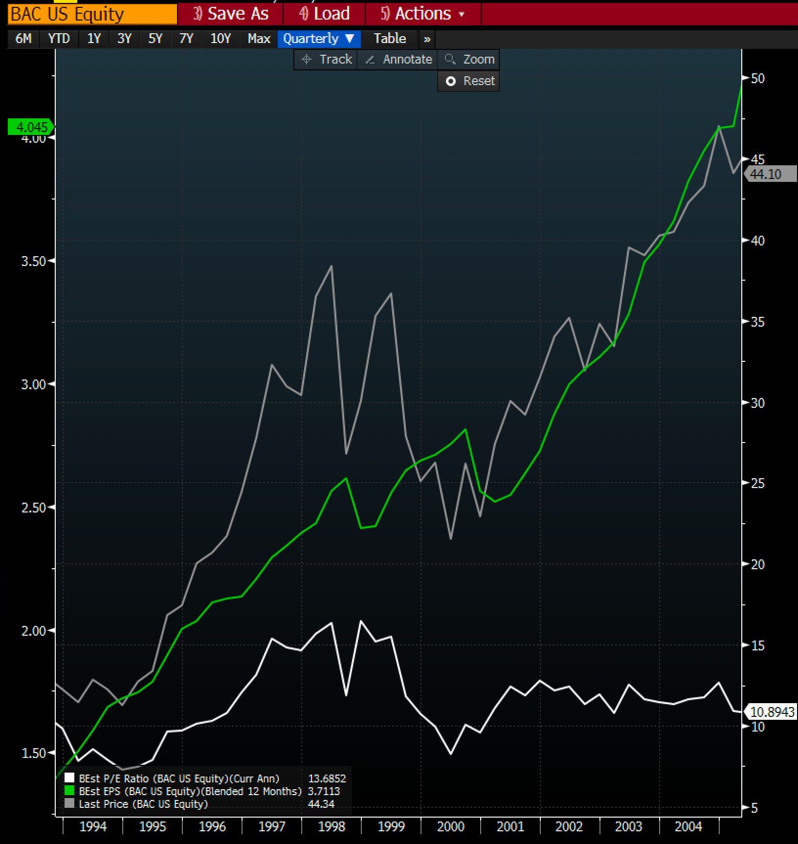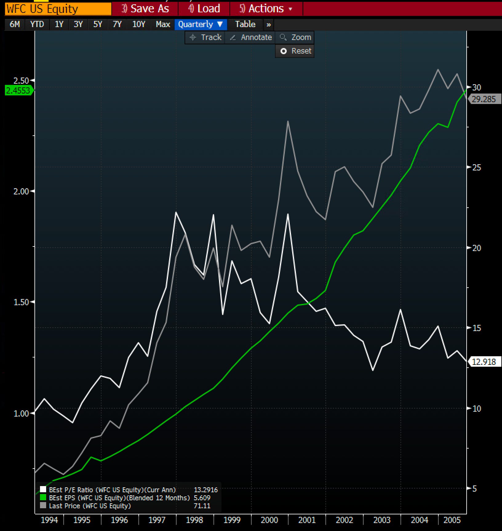 Wells Fargo (WFC): EPS grew from $0.70 to $2.45 (11.0% CAGR), while its stock price surged from $6 to $29 (14.0% CAGR).