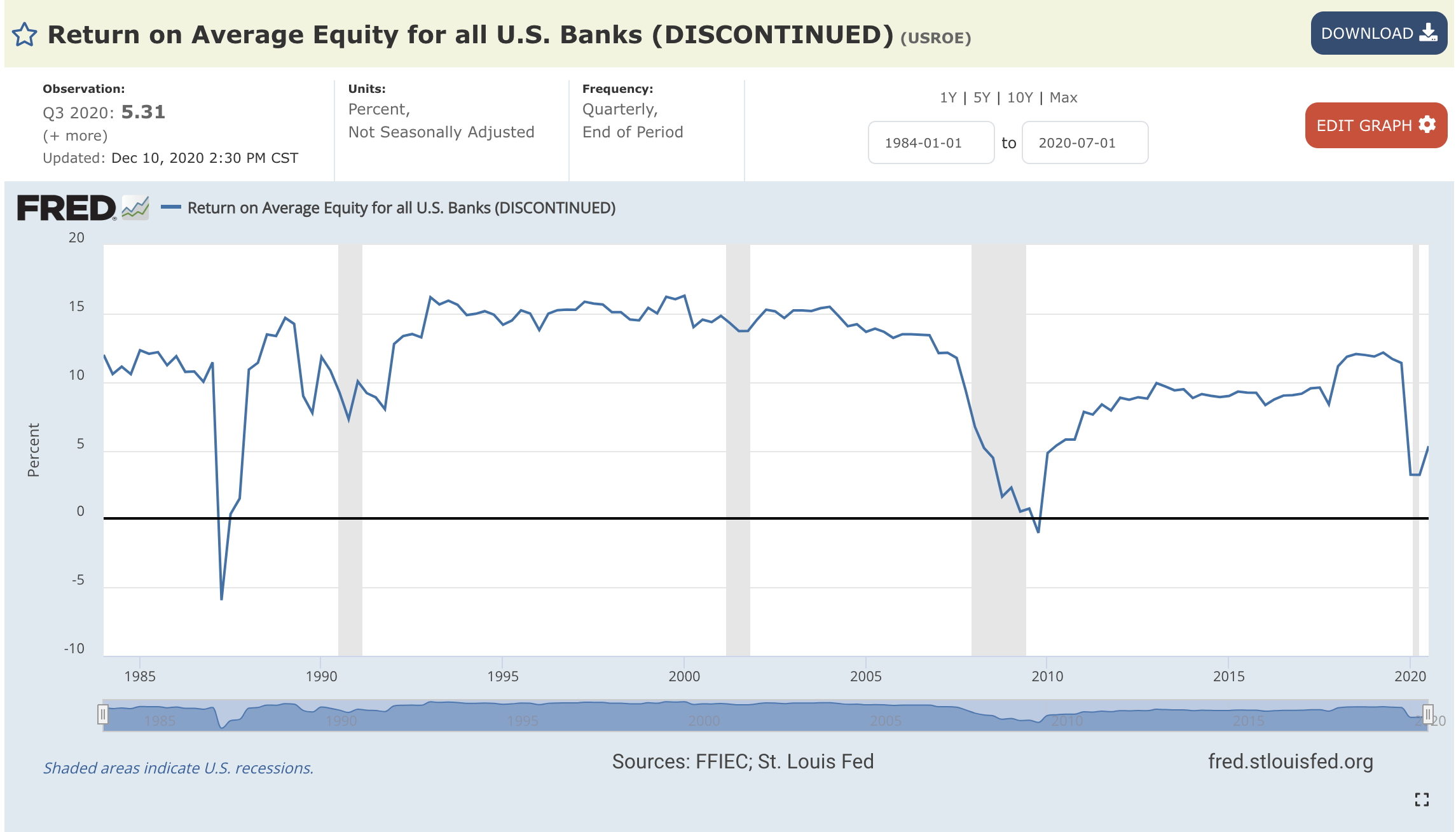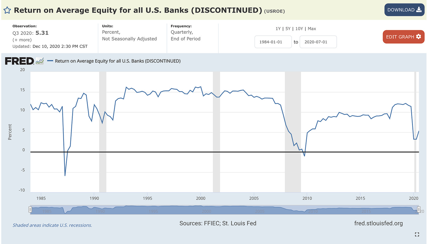 The graph above actually kinks upward in 2017 due to the Trump 45 Presidency. This bump was largely tax cut related (more net income into the same equity). But during the 45 Presidency Trump promised to roll back the more burdensome parts of Dodd-Frank, and he delivered: