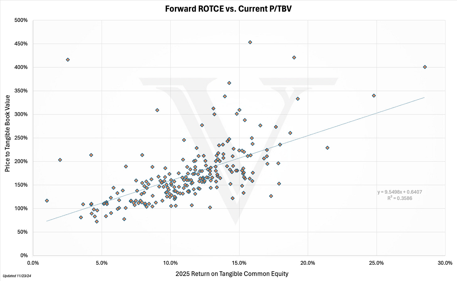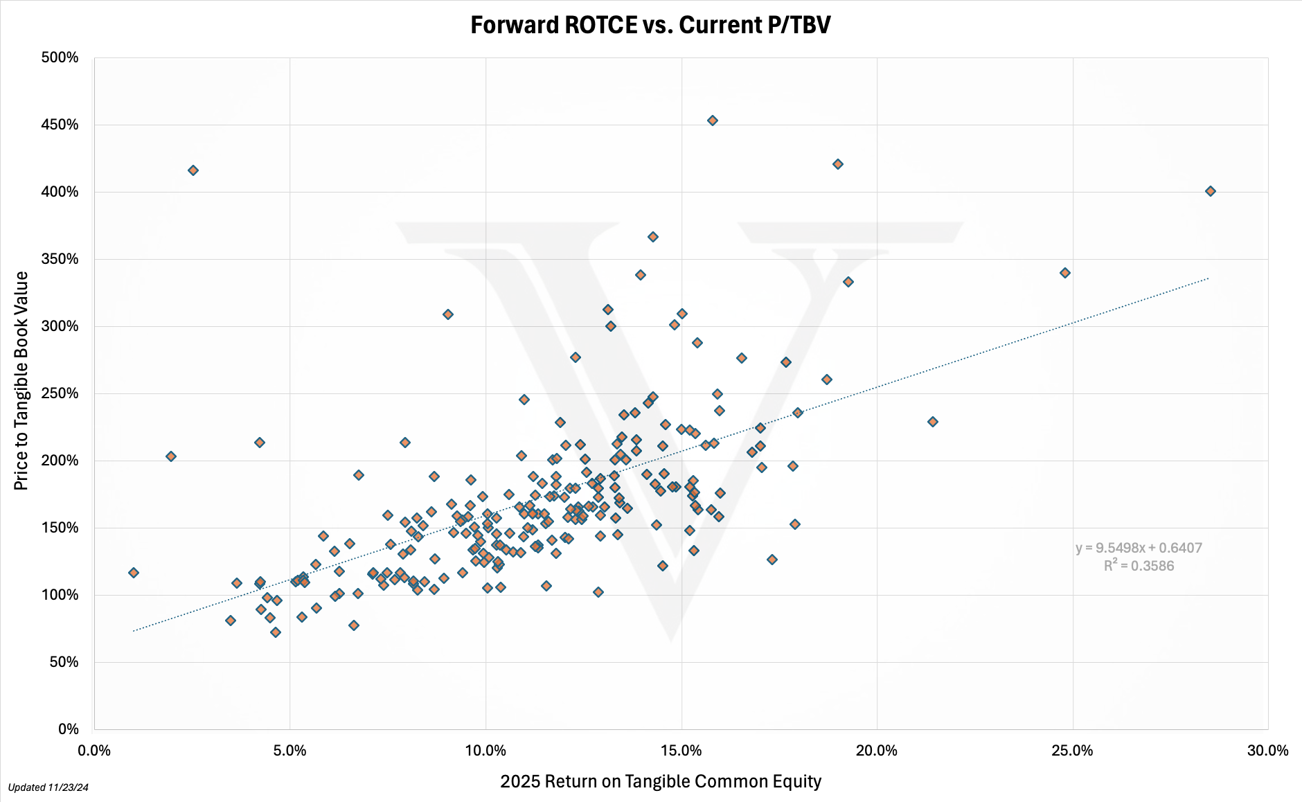 This is a tailwind for me because fundamentally if bank capital rules are loosened it creates a world where (as mentioned earlier) buybacks pick up, ROEs pick up, and bank valuations continue to improve. In the image above, not only would this help banks climb up the curve, but it would also lift all the boats and increase the slope of the ROTCE & P/TBV correlation upwards.