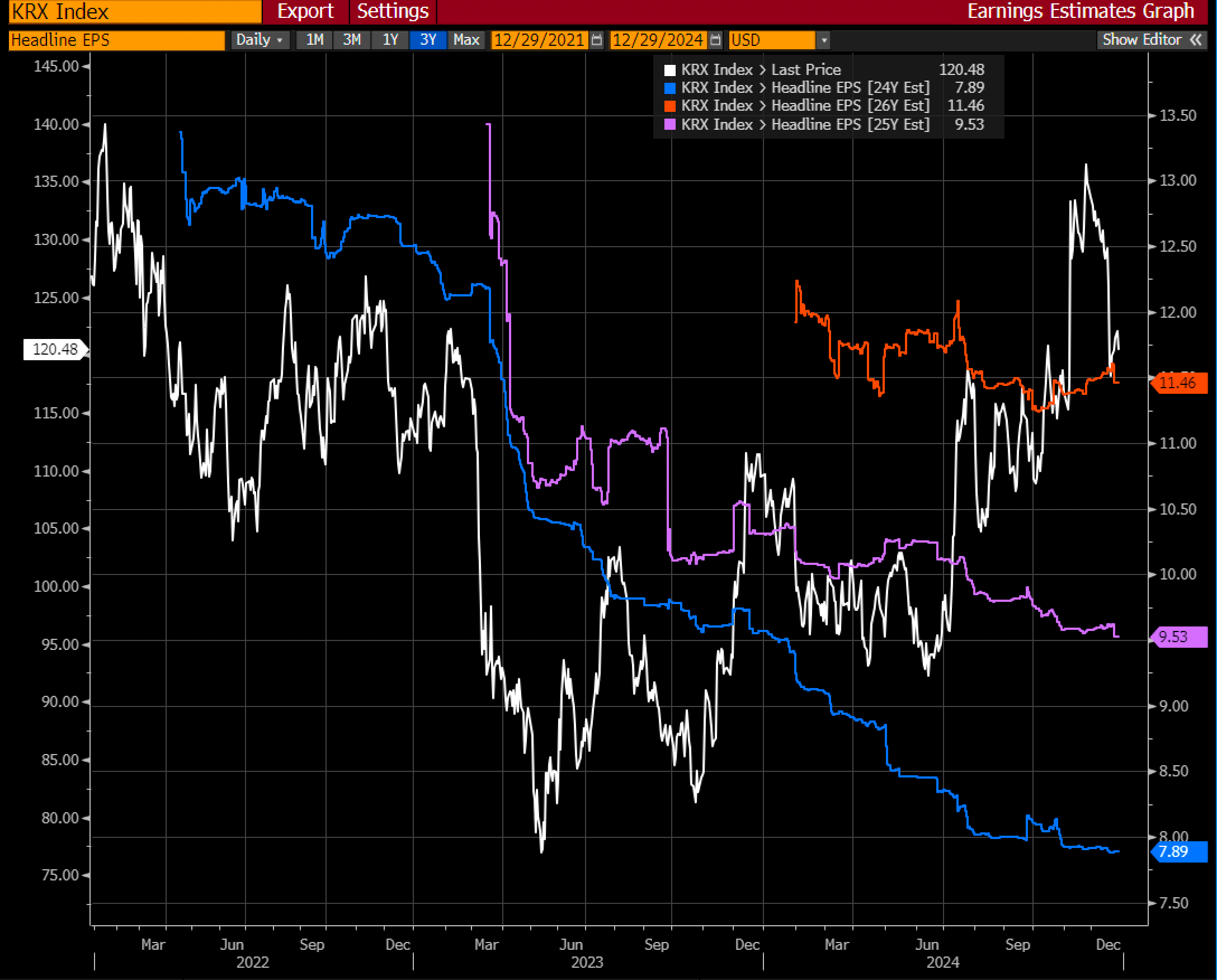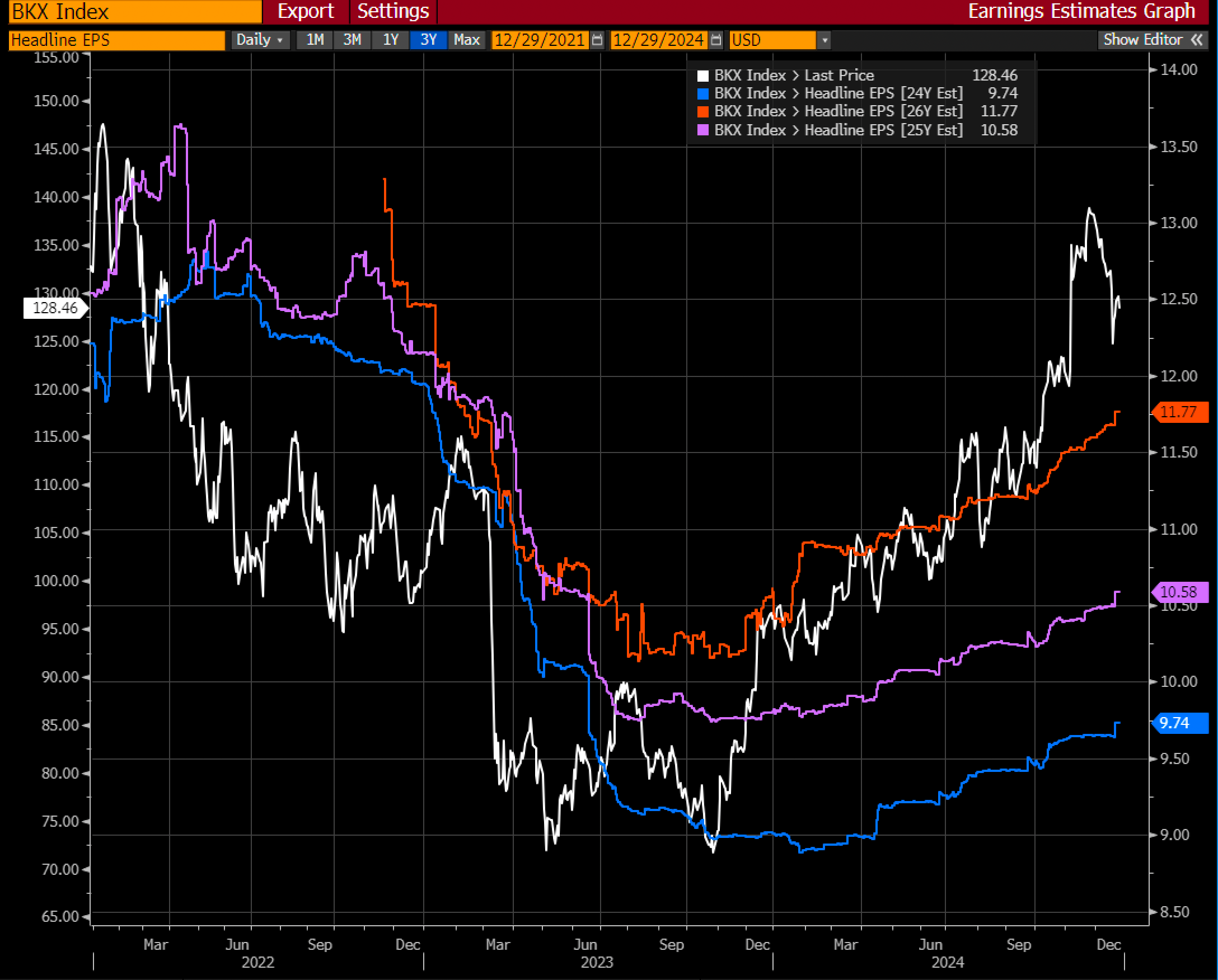 While the initial bank run and panic was bad, the fundamental earnings fallout was even worse for the banking industry. Deposits moved into higher-cost wholesale funding, including the Bank Term Funding Program (BTFP) a temporary program set up by the Fed to provide liquidity to markets. Net interest margins (NIMs) were squeezed, earnings estimates got slashed, and a dark cloud hung over the bank stock space. By the end of 2024, actual earnings per share (EPS) for the sector had dropped 20–30% below projections to start the year, falling from an expected $12 to just under $10. Forecasts for 2025 and 2026 were slashed as well. A grace check please for using Bloomberg consensus estimates on the indexes for my numbers, some astute (and way too knowledgeable of you) will poke that these are likely off by a penny or two.