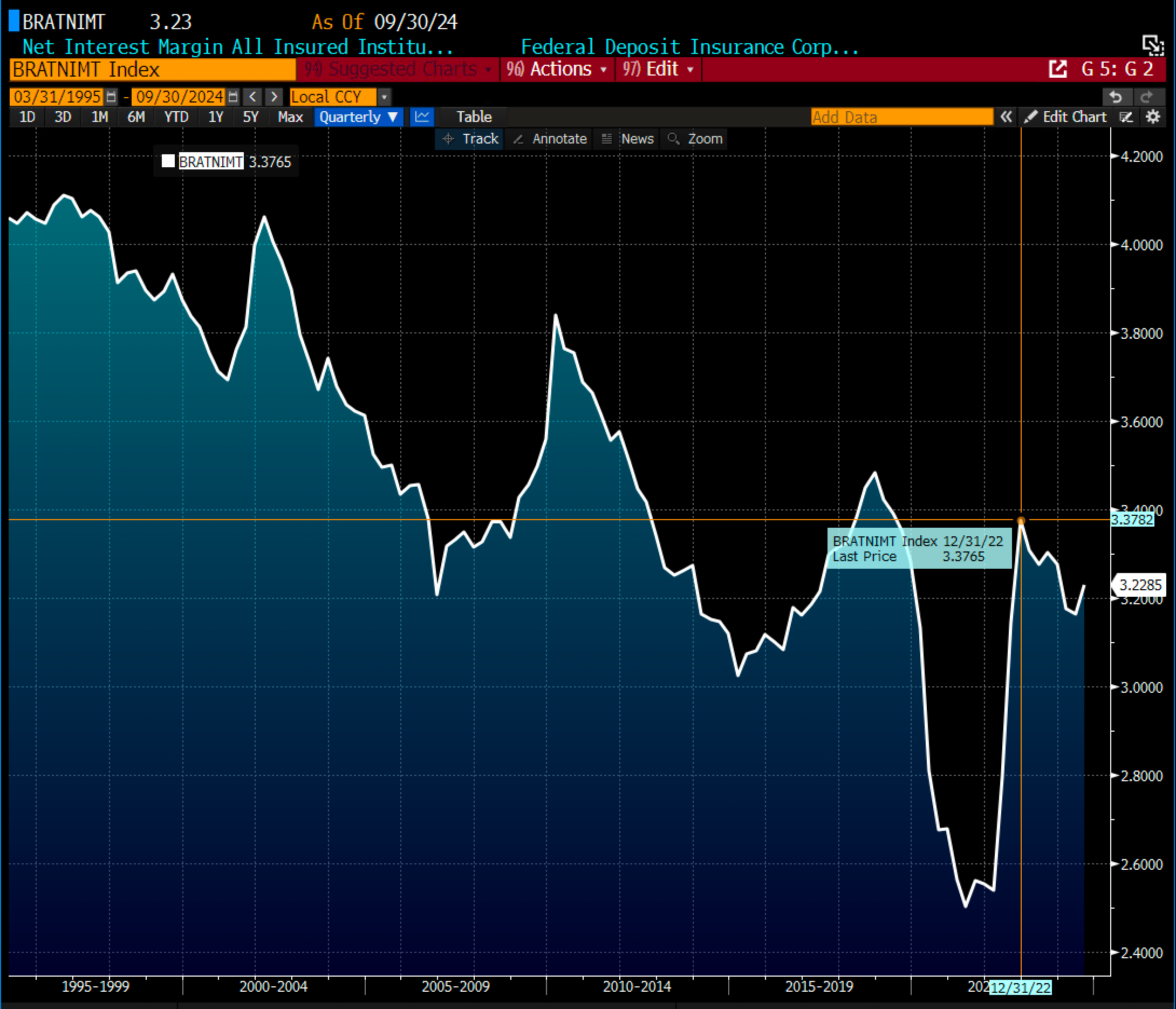 Taking the longest view, you can see that all bank industry NIM has been getting compressed since as long as we can remember, with intermittent periods of NIM expansion. The most recent of which in 2015-2019 (corresponding with a Trump Presidency) produced a healthy bank bull market.