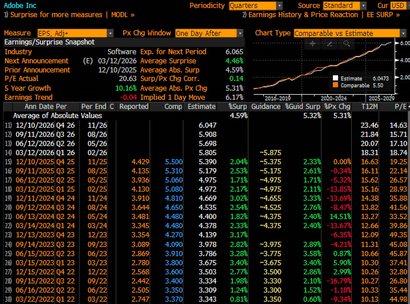 This was immediately followed by an expectation trap. People thought ADBE would grow. Throughout 2024 and 2025, Wall Street modeled some AI (and FIGMA) gains, with analysts whispering about a re-acceleration in EPS. But instead, Adobe printed steady, boring growth and the multiple collapsed with the Q4 of ‘24 report starting the real slide. $3.91 on expectations of $4.53 followed by a couple quarters later another $3.93 on expectations of $4.97.