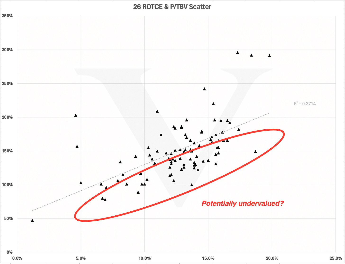 The regression line slopes cleanly upward, more ROTCE, higher P/TBV. Activists target the outliers below that line, the ones under-earning their worth. I look and I see a big grouping of potential targets.
