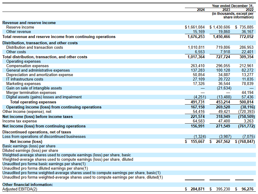 But how profitable is the bank of Circle? In 2024, Circle reported $156 million in net income on that $1.7 billion in revenue. And at least in my mind, the Coinbase scrape ain’t going anywhere and that’s north of $1 billion. It frankly is amazing that this thing IPO’d at $6.9 billion and shot up to $12 billion and then $24 billion which means you’re paying 14x revenue and it’s not like they can just “turn on” the profitability by cutting that $1 billion of Coinbase money. This was the most eye opening part of it all for me in the whole Circle deep dive.