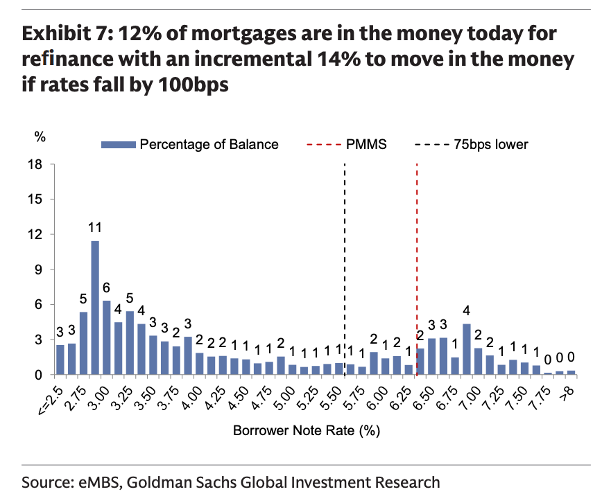 Rocket and COOP together service about $2.1 trillion in unpaid principal. When mortgage rates drift toward 5.5%, Goldman estimates that nearly $300 billion of that becomes economically attractive to refinance, with $200 billion coming from COOP’s book. These borrowers cost nothing to reacquire because they already sit in Rocket’s ecosystem. Many of those refinances produce incremental EBITDA margins around 70% because the customer acquisition cost rounds to zero.