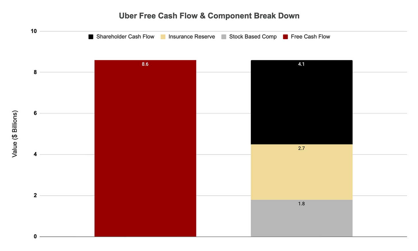 Start with the insurance reserve float. Uber manages its own captive insurance, which lowers long-run insurance costs, but as the business grows, the required reserves grow too. That reserve increase shows up as operating cash flow even though it isn’t cash available to owners. Roughly $2.7 billion of Uber’s TTM Q3 OCF came from reserve growth. Removing it takes the company from 16x to roughly 29x FCF.
