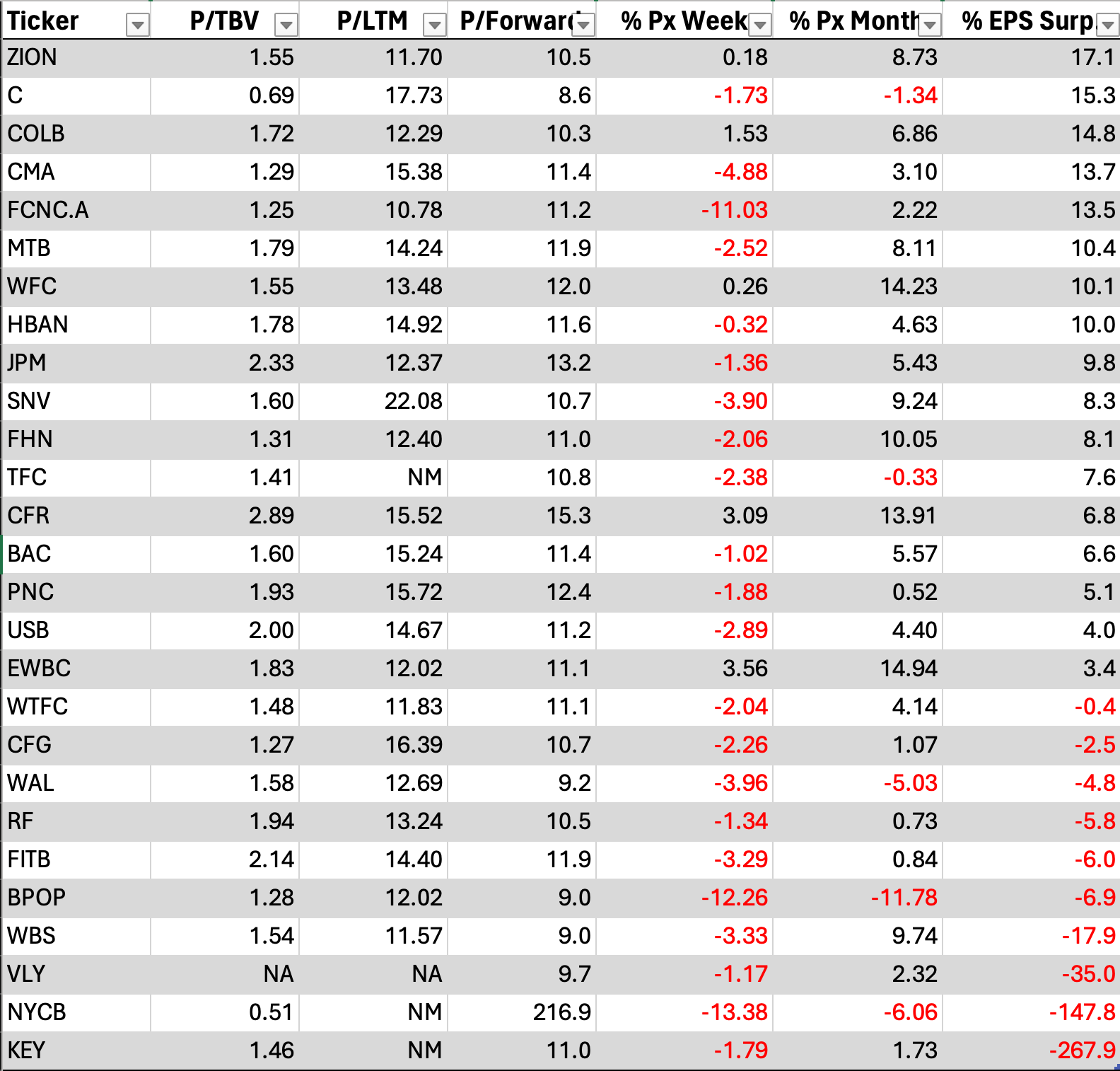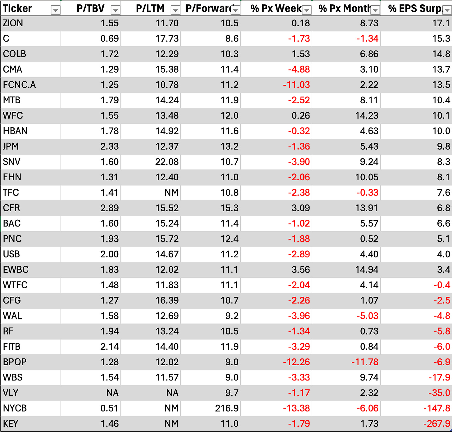 Before we get into the vibes check, here is the lay of the land as we sit today. I think CFR still has to report so this is pulling last quarter, but everyone else has. They’re ranked by biggest GAAP EPS surprise relative to others, and I also showed the weekly and month to date price change. Some big red numbers are showing on the week because we limped into the close this week. From a valuation standpoint, forward multiples seem “fair” if not slightly over valued. I’m not overly long into this last election push either.